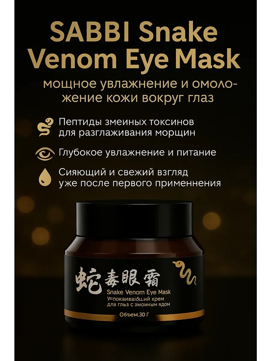 Крем для кожи вокруг глаз Змеиный яд — эффективный уход для зоны вокруг глаз, направленный на уменьшение и предотвращение признаков старения. Благодаря синтетическому пептиду Syn-ake, действие которого близко к яду храмовой гадюки, крем мягко расслабляет мимическую мускулатуру, разглаживая как мелкие, так и глубокие морщины, придавая коже гладкость и свежесть без уколов и хирургических процедур. Лёгкая, питательная формула глубоко увлажняет, повышает эластичность и упругость кожи, устраняет тёмные круги и мешки под глазами, возвращая взгляду молодость и сияние. Средство обладает выраженным омолаживающим и защитным эффектом, делая кожу ухоженной, гладкой и отдохнувшей.