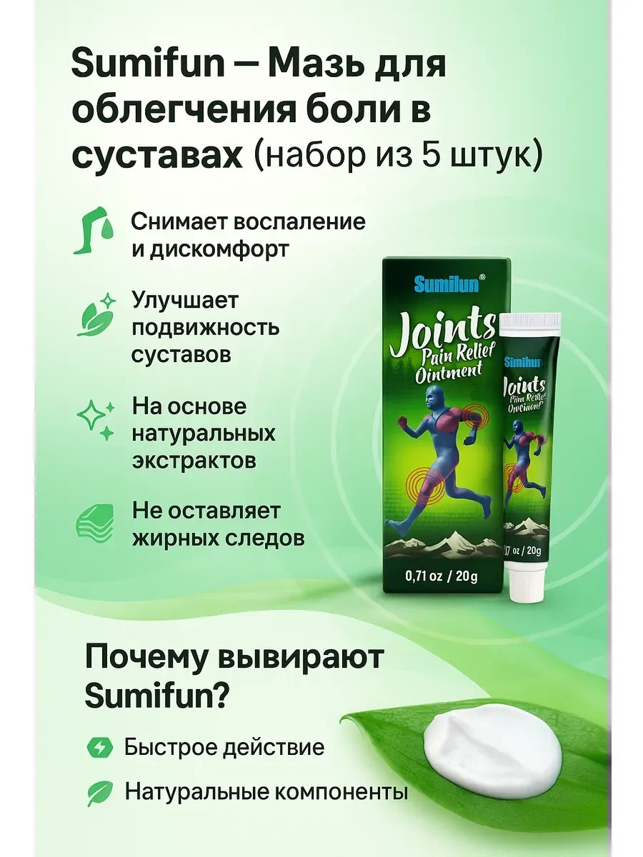 Sumifun Joint Pain Relief Ointment — эффективное средство для снятия боли и воспаления в суставах, мышцах и связках. Подходит при артрите, артрозе, остеохондрозе, радикулите, спортивных травмах и ушибах. Содержит натуральные экстракты (куркума, ладан, мята, камфора), которые способствуют улучшению подвижности и ускоряют восстановление. Лёгкая текстура быстро впитывается, не оставляет жирных следов и подходит для ежедневного применения. Рекомендуется для коленей, локтей, плеч, спины, шеи. Простое нанесение — всего 2–3 раза в день для заметного эффекта. Отличный выбор для спортсменов, активных людей и тех, кто заботится о здоровье суставов. Удобный формат набора позволяет использовать мазь дома, на работе или в поездках.