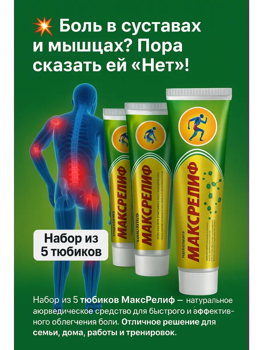 МаксРелиф крем для суставов и мышц. Аюрведический обезболивающий крем МаксРелиф — эффективное средство от боли в спине, суставах, мышцах, пояснице, коленях и шее. Подходит при артрите, остеохондрозе, радикулите, растяжениях, ушибах и судорогах. оптимальное решение для всей семьи, тренировок и домашней аптечки. Натуральный состав: ментол, эвкалипт, камфора — обеспечивают быстрое снятие воспаления, улучшают кровообращение и расслабляют мышцы. Крем от боли в мышцах и суставах МаксРелиф быстро впитывается, не оставляет следов и приятен в использовании. Удобная упаковка для поездок и спорта. Идеально подходит для ежедневного применения. Оригинальный продукт от Himani, Индия. МаксРелиф мазь от боли, мазь для суставов, аюрведа, обезболивающий крем, лучший крем для суставов.