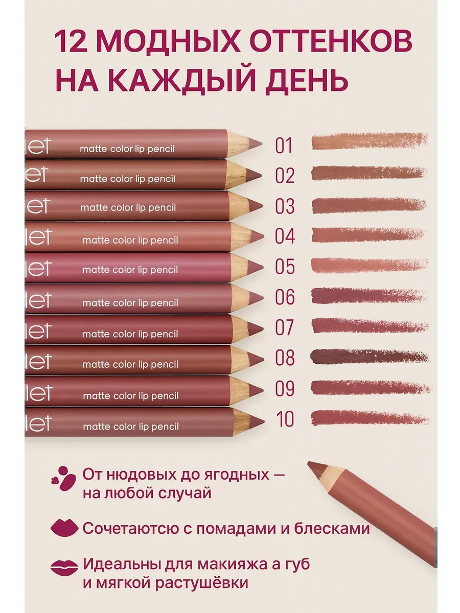 Набор карандашей для губ Violet Matte Color Lip Pencil (12 штук) — это идеальное решение для создания безупречного контура и стойкого макияжа губ. Каждый карандаш оснащён удобной встроенной точилкой в колпачке, что позволяет всегда поддерживать чёткий срез без дополнительных аксессуаров. Насыщенные матовые оттенки варьируются от нюдовых и бежевых до насыщенно-ягодных и винных, подходя под любой тип внешности и стиль.