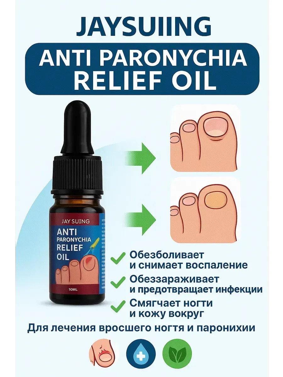 Масло JAYSUING Anti Paronychia Relief Oil — эффективное средство для ухода за воспалённой кожей вокруг ногтя (паронихия) и лечения вросшего ногтя. Натуральный состав с маслом чайного дерева, ромашки, лаванды и касторовым маслом снимает боль, уменьшает воспаление и обеззараживает. Подходит для ног и рук. Обеспечивает мягкий уход, способствует заживлению кожи и смягчению ногтевой пластины. Удобный флакон с пипеткой позволяет точно наносить средство на проблемную зону. Идеально при покраснении, отёке, нагноении или дискомфорте в области ногтей. Не содержит парабенов и агрессивных компонентов. Подходит для домашнего использования, быстро впитывается и не оставляет жирных следов. .