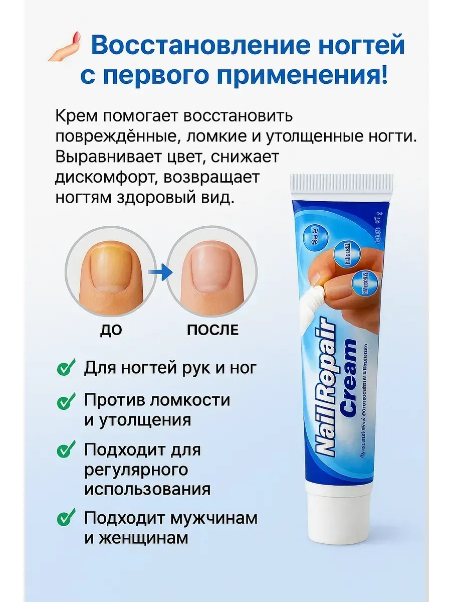 Крем помогает в уходе после грибковых инфекций, атрофии или травм. Он нормализует рост ногтя и способствует его здоровому обновлению. При регулярном применении ногти становятся крепкими, ровными и ухоженными.