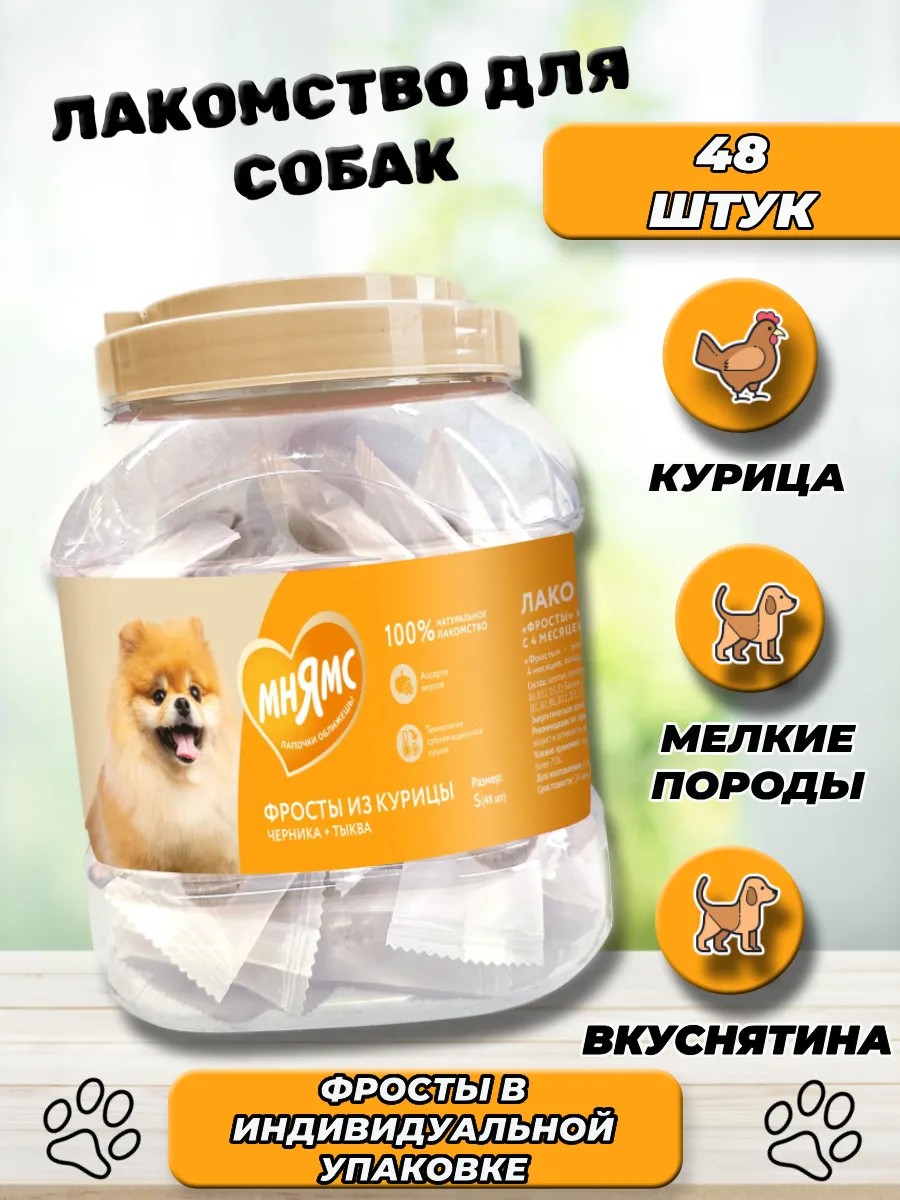 "Мнямс" Лакомство "Фросты" из курицы для собак и щенков с 4 месяцев - это сублимированные беззерновые лакомства с высоким содержанием животного белка (куриная грудка 73%), созданные при помощи прогрессивной технологии сушки, которая сохраняет натуральный вкус мяса и питательные свойства ингредиентов.