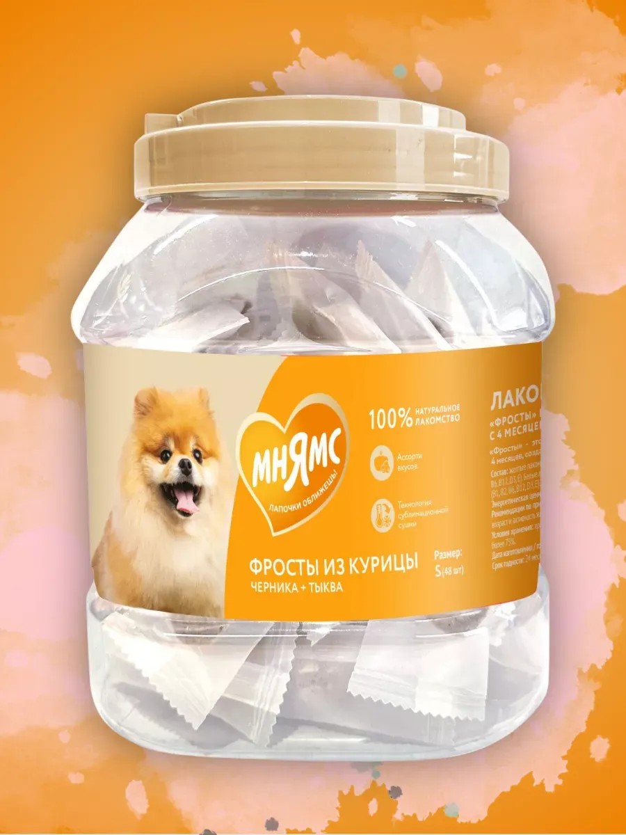 "Mnyams" Frosty chicken treats for dogs and puppies from 4 months old are freeze-dried grain-free treats with a high content of animal protein (73% chicken breast), created using advanced drying technology that preserves the natural taste of meat and the nutritional properties of the ingredients. Blueberries and pumpkin in the composition are rich in vitamins and antioxidants that improve metabolism. One package of Frosty contains two types of treats: chicken with blueberries and chicken with pumpkin, which are suitable for pets of all breeds. For dogs of different weights, different consumption rates are provided: from 1 Frosty per day for dogs weighing <5 kg to >5 Frosty per day for dogs weighing over 25 kg. Size S, 48 pieces in a package. Frosty treats Chicken food for dogs and puppies from 4 months is very tasty and will not leave even the most picky pet indifferent!