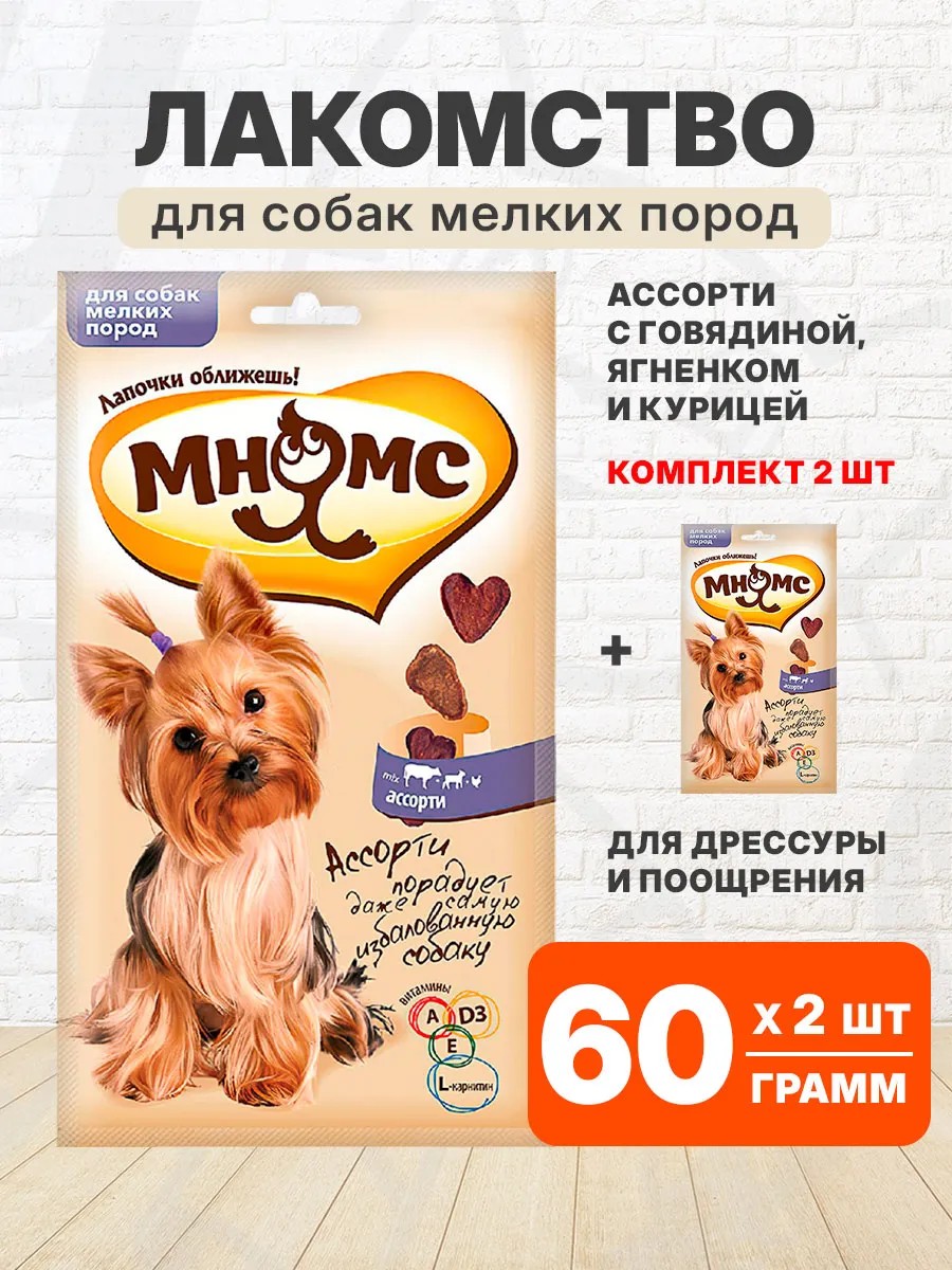 Ассорти «Мнямс»- это вкусное и здоровое лакомство с большим содержанием мяса, специально созданное для собак мелких пород.
