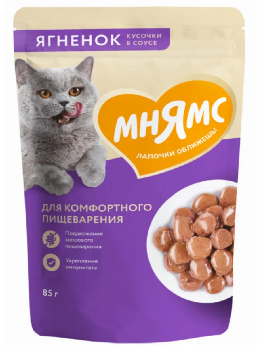 Корм для кошек влажный Мнямс для комфортного пищеварения у взрослых животных, кусочки ягненка в соусе, пауч 85г.