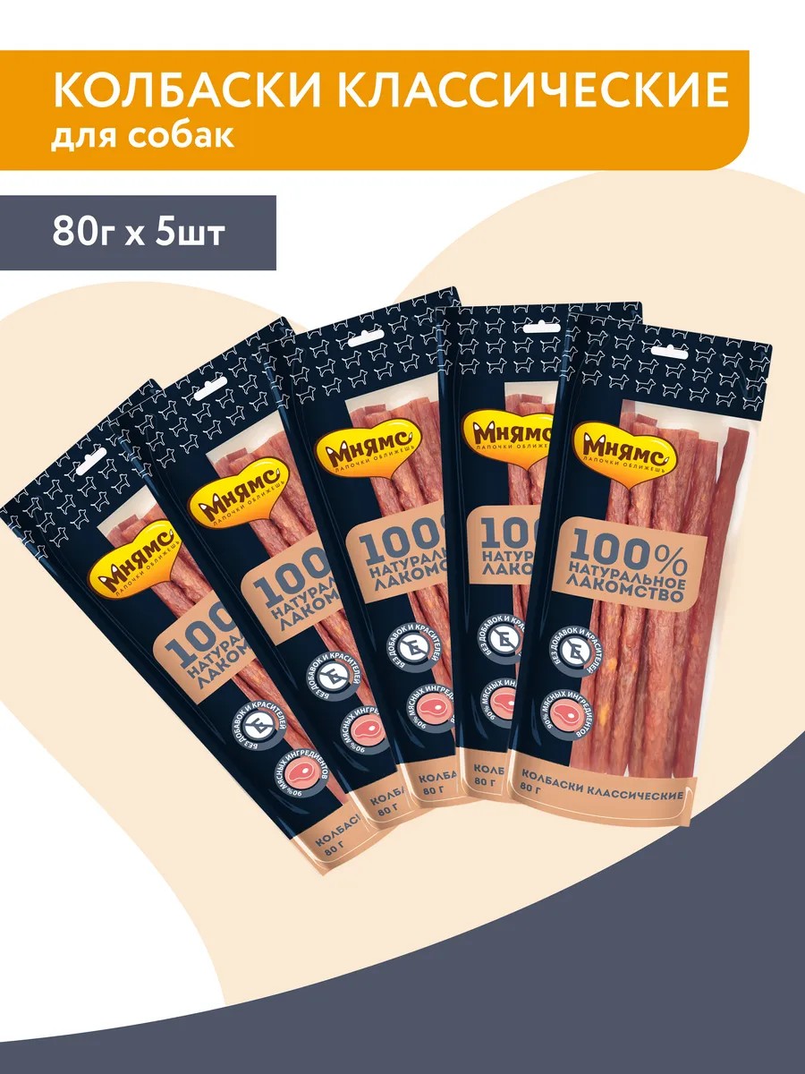 Мнямс лакомство для собак колбаски «классические» - вкусное и полезное лакомство с большим содержанием мяса для собак и щенков старше 3-х месяцев. Обладают высокой вкусовой привлекательностью, благотворно влияют на нервную и сосудистую системы, содержат розмарин- натуральный источник магния, калия, натрия, железа и фосфора. Идеально подходят в качестве ежедневного угощения и поощрения во время тренировок.