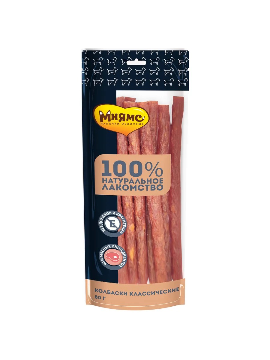 Мнямс лакомство для собак колбаски «классические» - вкусное и полезное лакомство с большим содержанием мяса для собак и щенков старше 3-х месяцев. Обладают высокой вкусовой привлекательностью, благотворно влияют на нервную и сосудистую системы, содержат розмарин- натуральный источник магния, калия, натрия, железа и фосфора. Идеально подходят в качестве ежедневного угощения и поощрения во время тренировок.