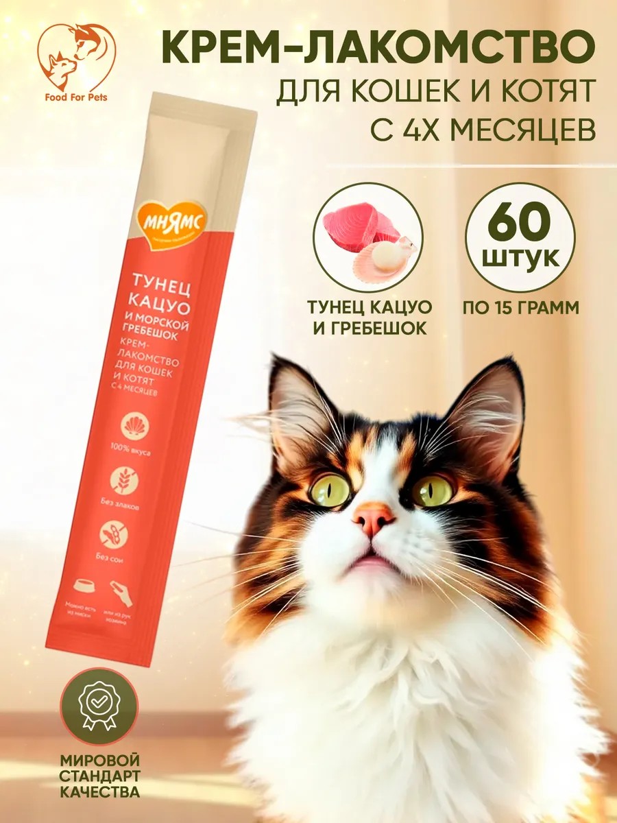 Лакомства для кошек – это не просто еда, это полезное угощение! Подойдут котятам и взрослым привередливым котам. Диетический тунец и гребешок, представляют собой нежную консистенцию крема. Обладает утонченным вкусом, который вызывает восторг и яркие эмоции у пушистых любимцев. Влажная текстура позволяет использовать их как соус или даже суп к основному корму. Идеальны для обучения и дрессировки!