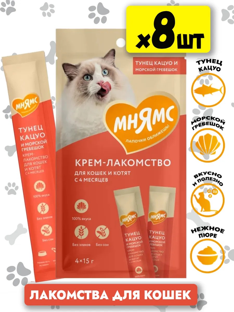 Мнямс Крем-лакомство для кошек, с тунцом Кацуо и морским гребешком 8шт 15гр