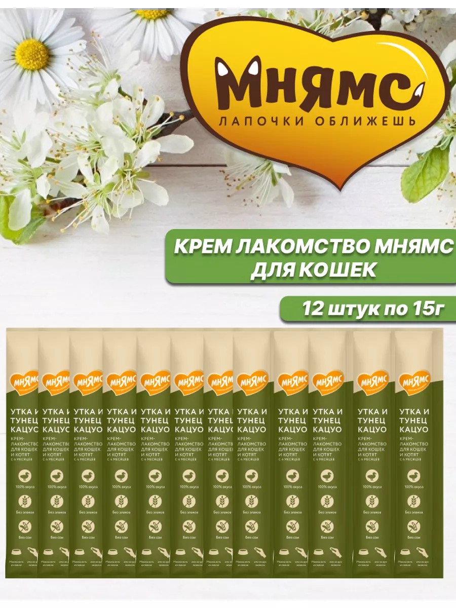 Крем-лакомство «Мнямс» с уткой и тунцом "Кацуо" – это излюбленное кошками угощение с нежнейшей кремовой текстурой.