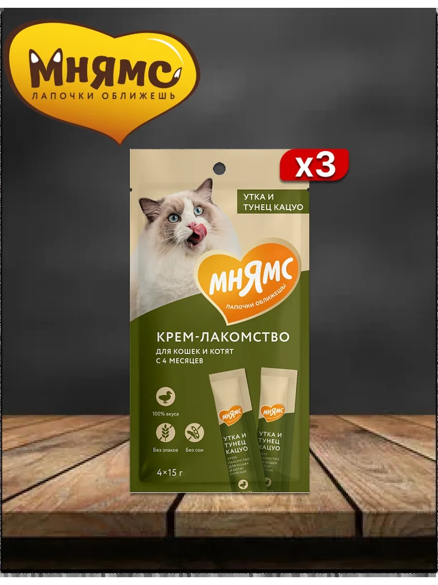 Крем-лакомство «Мнямс» с уткой и тунцом "Кацуо" – это излюбленное кошками угощение с нежнейшей кремовой текстурой.