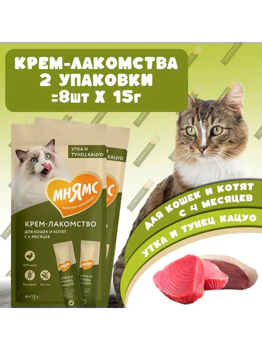 Крем-лакомство «Мнямс» с уткой и тунцом "Кацуо" – это излюбленное кошками угощение с нежнейшей кремовой текстурой.
