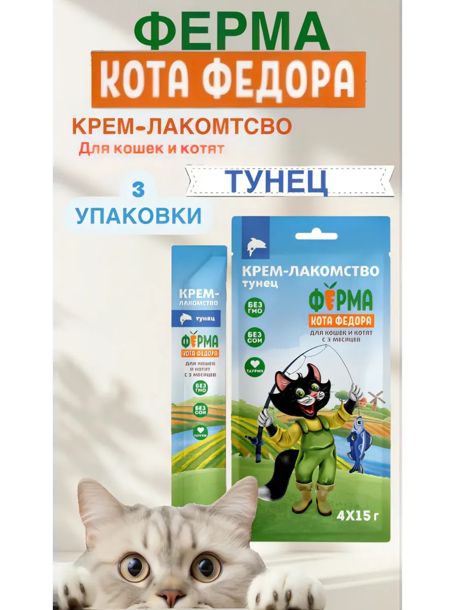 Крем-лакомство "Ферма кота Федора" из тунца - это излюбленное кошками угощение с нежнейшей кремовой текстурой, которое разнообразит рацион и поможет почувствовать все радости фермерской жизни. Подается как порционное угощение, или добавляется в виде аппетитного соуса к основному рациону для обогащения вкуса привычных блюд. Изготовлено по новейшей японской технологии и соответствует мировым стандартам качества. Упаковка включает в себя 4 порционных саше весом 15 г.