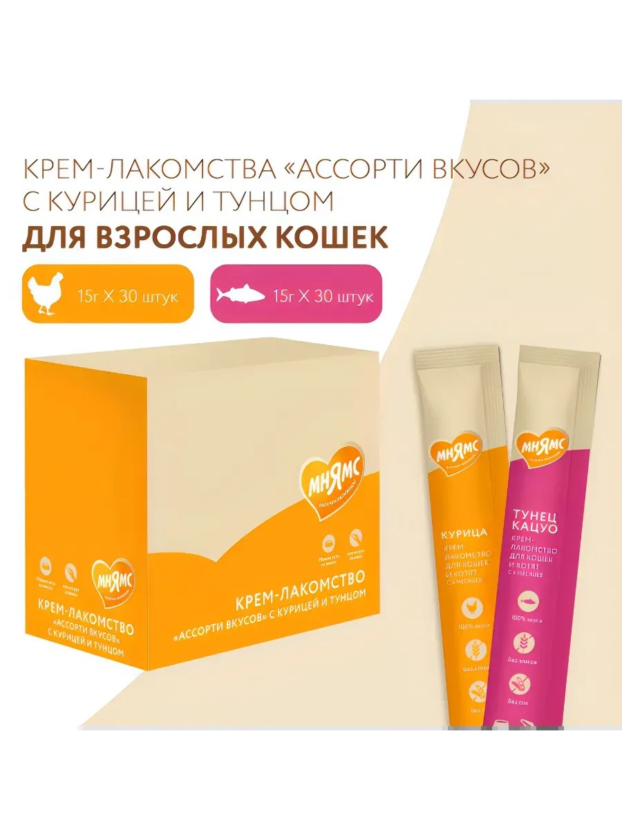 | Package contents | Mnyams Cream treat for cats and kittens from 4 months "Assorted flavors" with chicken and tuna 60 pcs x 15 g |