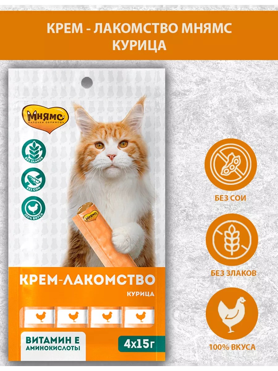 Крем-лакомство с курицей Диетическая куриная грудка Крем-лакомство «Мнямс» с курицей – это изысканное угощение с нежнейшей кремовой консистенцией. Утонченный вкус приводит кошек в восторг, а яркие эмоции довольных любимцев при кормлении с рук дарят хозяевам ощущение полного счастья. Подается как порционное угощение, или добавляется в виде аппетитного соуса к основному рациону для обогащения вкуса привычных блюд. Изготовлено по новейшей японской технологии и соответствует мировым стандартам качества.