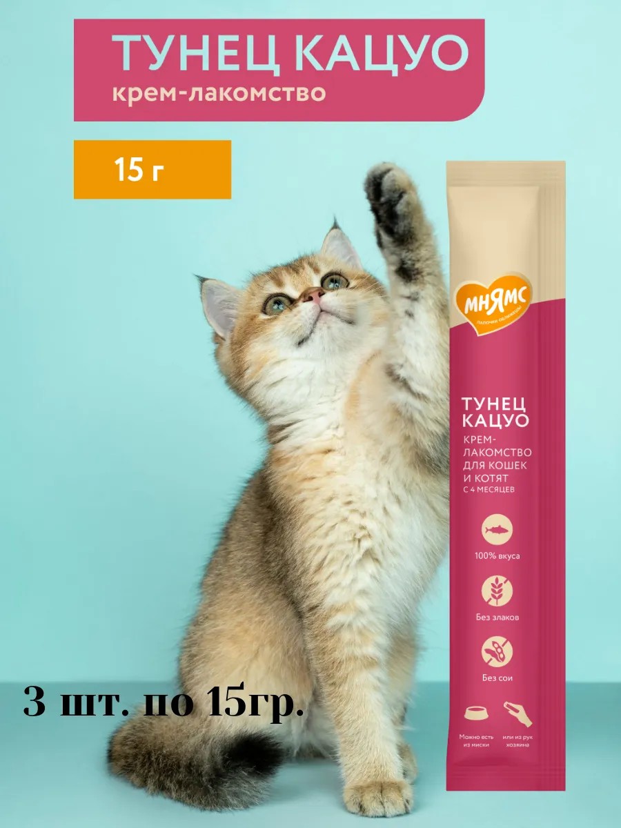 Крем-лакомство «Мнямс» с тунцом – это изысканное угощение с нежнейшей кремовой консистенцией. Тёмно-красное мясо деликатесного малого тунца, утонченный вкус приводит кошек в восторг, а яркие эмоции довольных любимцев при кормлении с рук дарят хозяевам ощущение полного счастья. Подается как порционное угощение, или добавляется в виде аппетитного соуса к основному рациону для обогащения вкуса привычных блюд. Изготовлено по новейшей японской технологии и соответствует мировым стандартам качества.