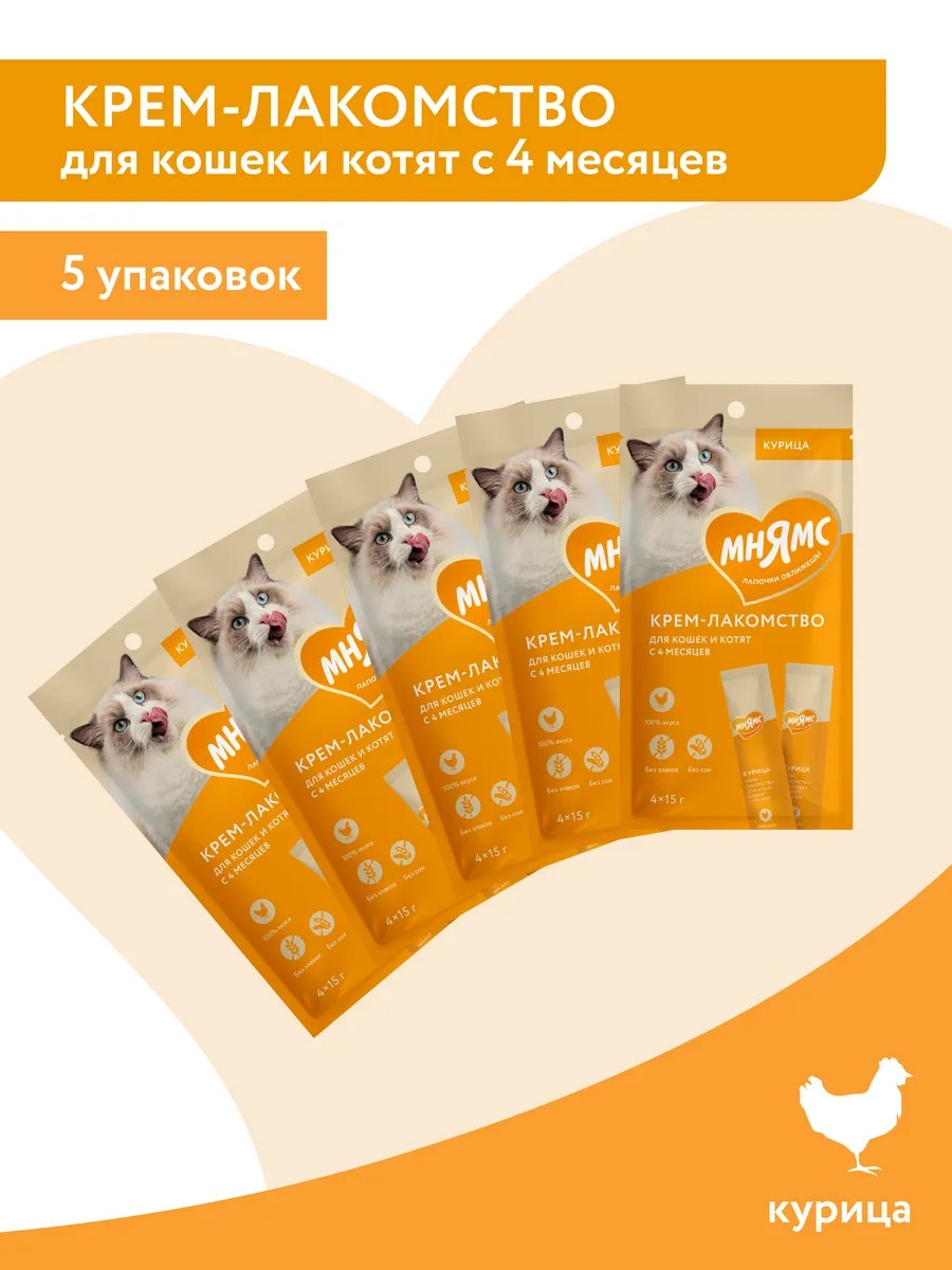 Крем-лакомство Мнямс - это изысканное угощение с нежнейшей кремовой консистенцией. Утонченный вкус приводит кошек в восторг, а яркие эмоции довольных любимцев при кормлении с рук дарят хозяевам ощущение полного счастья. Подается как порционное угощение, или добавляется в виде аппетитного соуса к основному рациону для обогащения вкуса привычных блюд. Изготовлено по новейшей японской технологии и соответствует мировым стандартам качества.