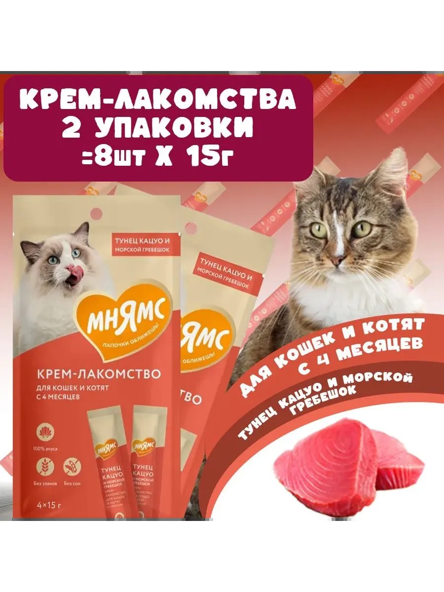 Крем-лакомство с тунцом Кацуо и морским гребешком Тёмно-красное мясо деликатесного малого тунца Крем-лакомство «Мнямс» с тунцом – это изысканное угощение с нежнейшей кремовой консистенцией. Утонченный вкус приводит кошек в восторг, а яркие эмоции довольных любимцев при кормлении с рук дарят хозяевам ощущение полного счастья. Подается как порционное угощение, или добавляется в виде аппетитного соуса к основному рациону для обогащения вкуса привычных блюд. Изготовлено по новейшей японской технологии и соответствует мировым стандартам качества.