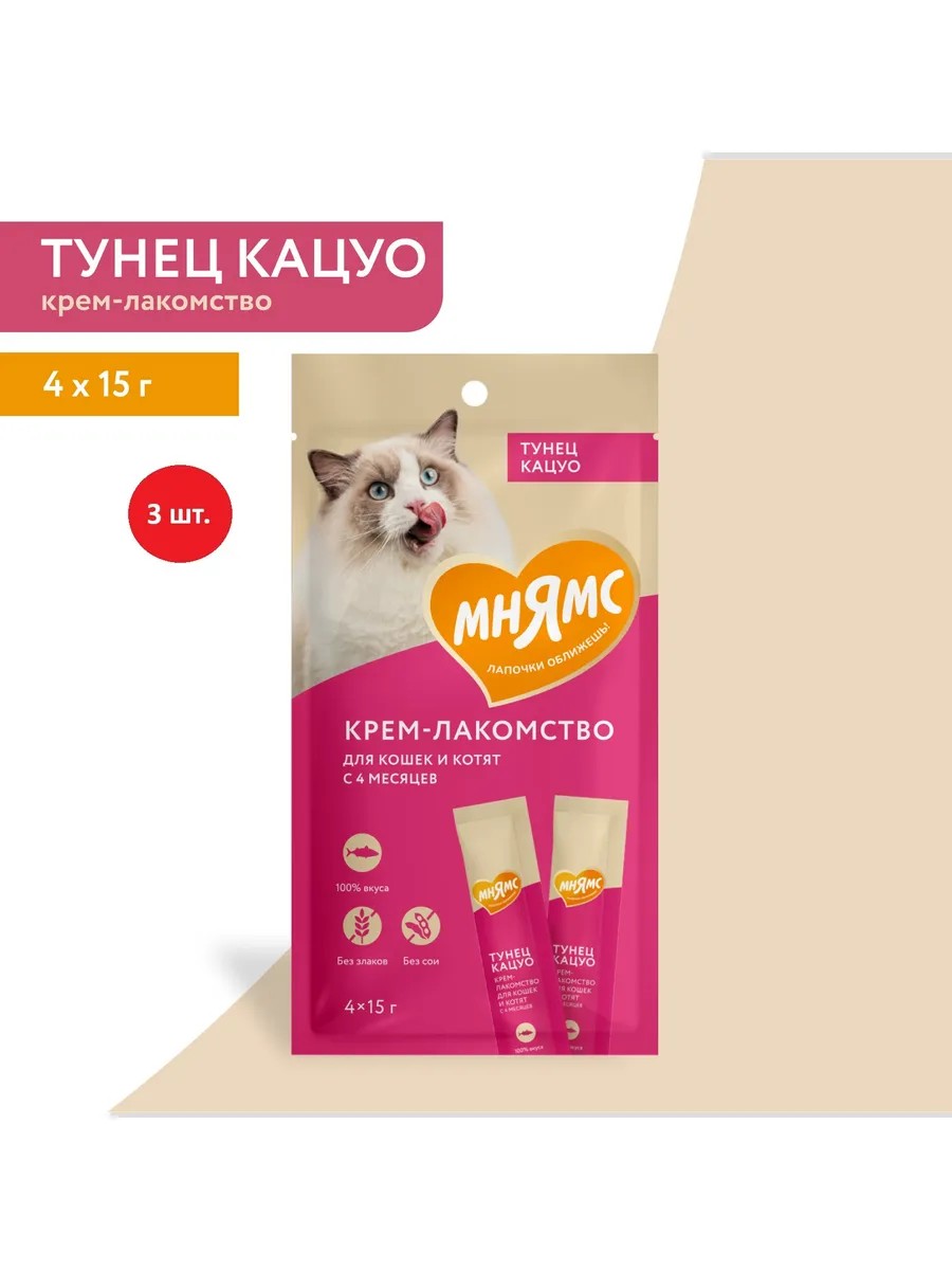 Крем-лакомство «Мнямс» с тунцом – это изысканное угощение с нежнейшей кремовой консистенцией. Тёмно-красное мясо деликатесного малого тунца, утонченный вкус приводит кошек в восторг, а яркие эмоции довольных любимцев при кормлении с рук дарят хозяевам ощущение полного счастья. Подается как порционное угощение, или добавляется в виде аппетитного соуса к основному рациону для обогащения вкуса привычных блюд. Изготовлено по новейшей японской технологии и соответствует мировым стандартам качества.