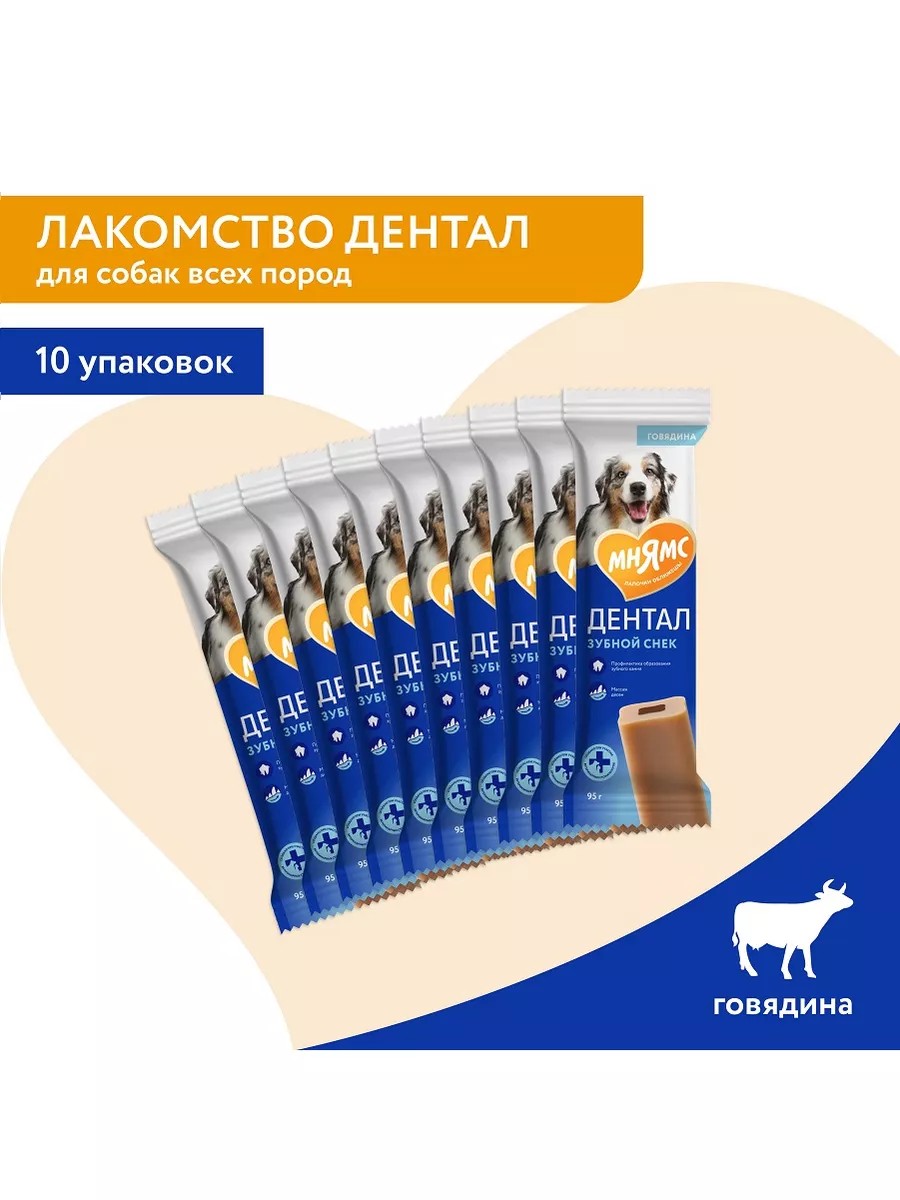 Мнямс ДЕНТАЛ "Зубной снек"с говядиной – вкусное и полезное лакомство для взрослых собак крупных пород и щенков крупных пород старше 3-х месяцев. Обладает высокой вкусовой привлекательностью и прекрасной поедаемостью. Благодаря особой форме гарантирует тщательное очищение даже самых труднодоступных мест полости рта, предотвращает появление налета и обеспечивает профилактику появления зубного камня, обладает антибактериальным и освежающим действием, деликатно массирует десны.