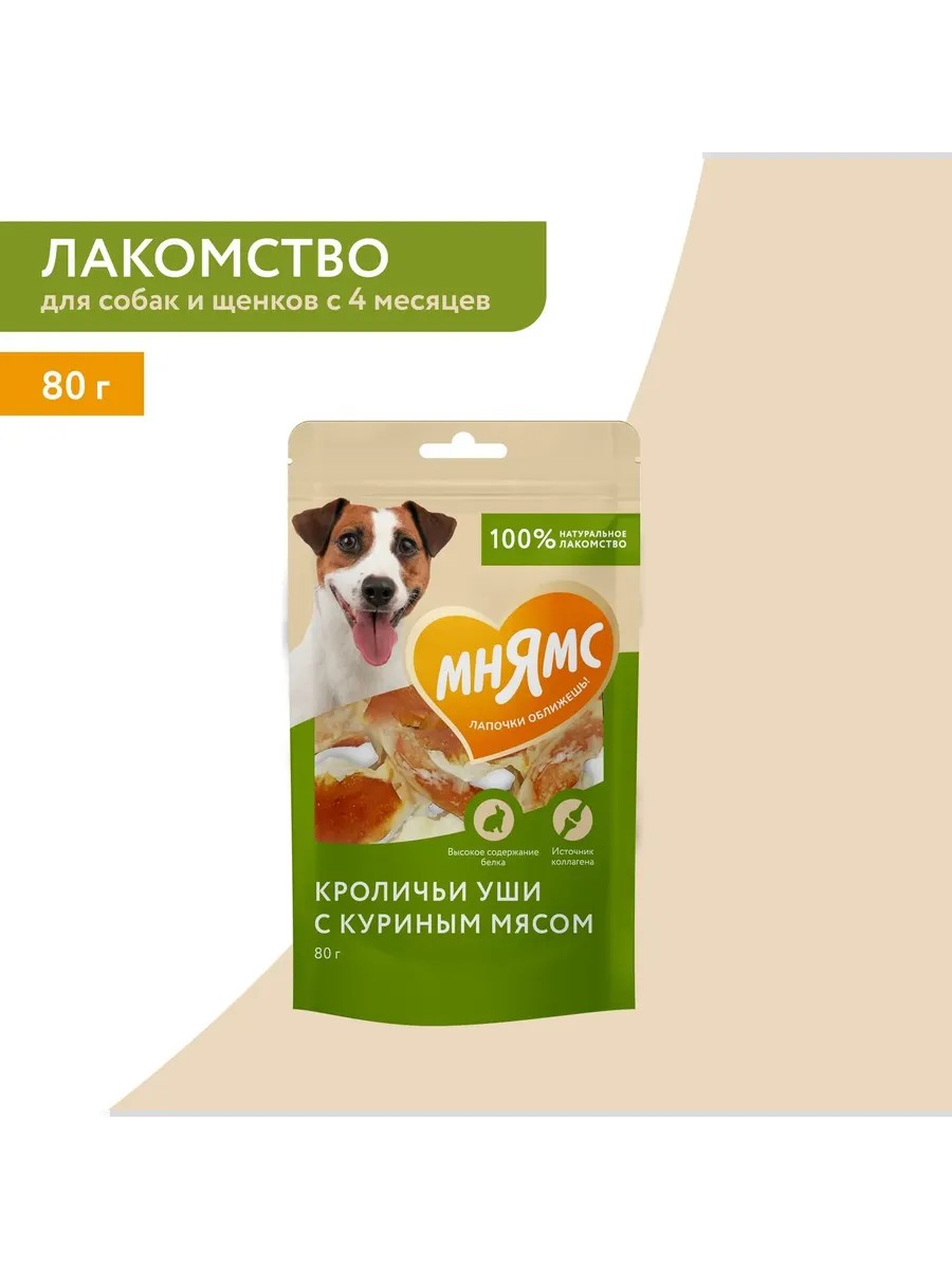 A natural treat for adult and growing dogs (from four months). Rabbit ears with chicken meat "Mnyams" is a healthy dietary treat containing easily digestible protein. This true delicacy with dried slices of select fillet will satisfy even the most capricious pet.
