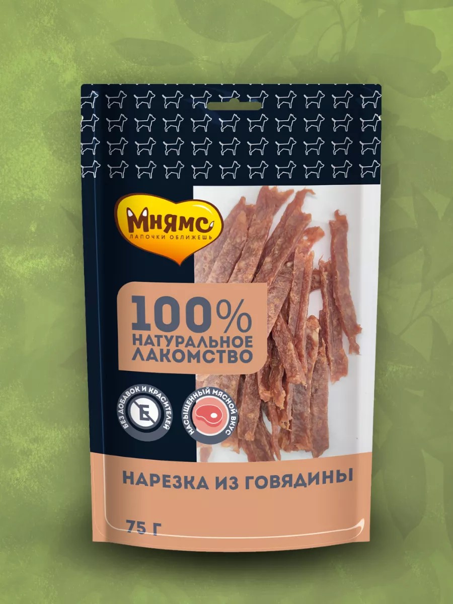 | Количество предметов в упаковке | Лакомство для собак Нарезка из говядины 75г |