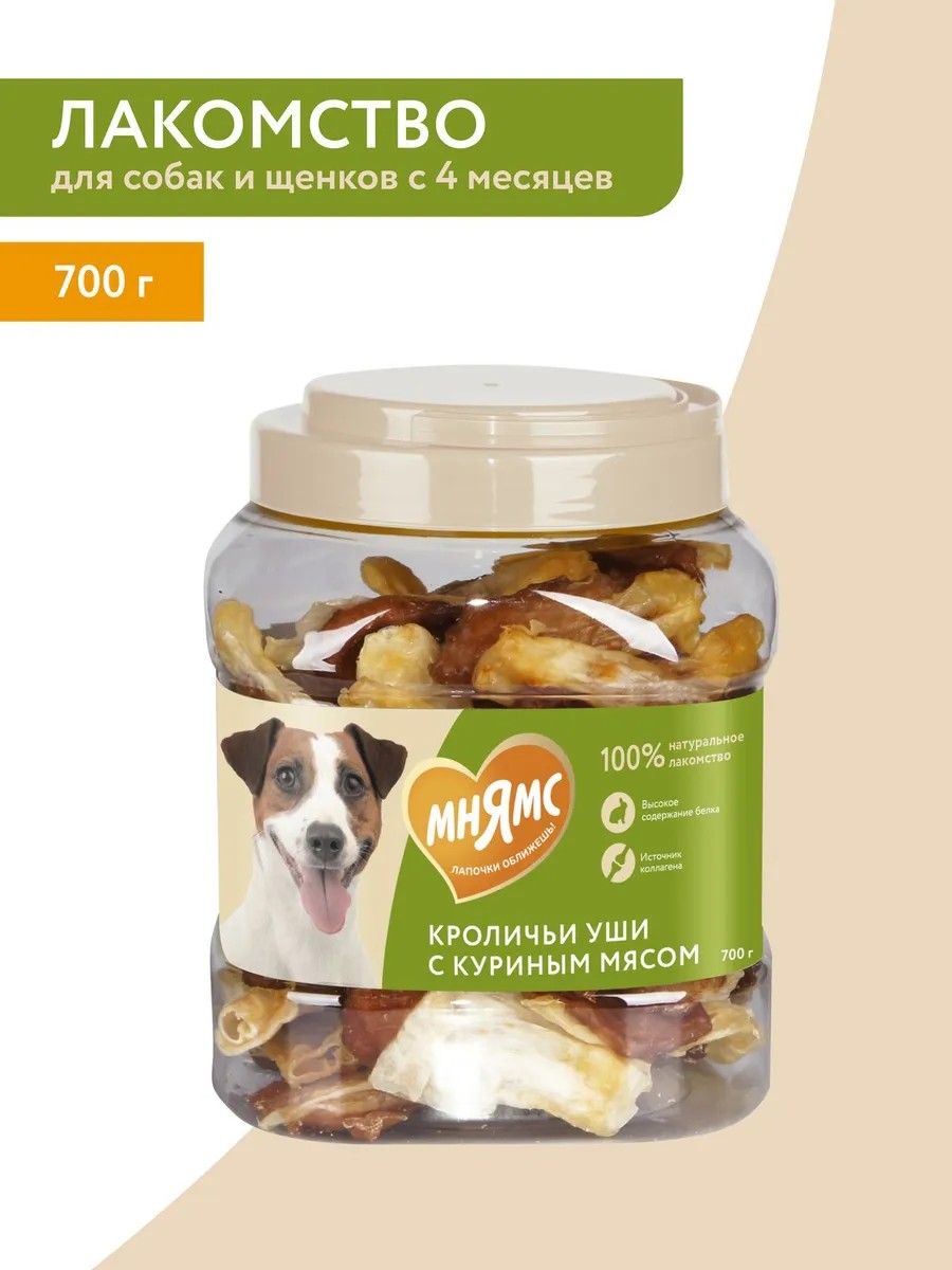 Натуральное лакомство для взрослых и растущих собак (с четырех месяцев).Кроличьи уши с куриным мясом "Мнямс" - это полезное диетическое лакомство, содержащее легкоусвояемый белок. Настоящий деликатес с вялеными ломтиками отборного филе не оставит равнодушным даже самого капризного любимца.