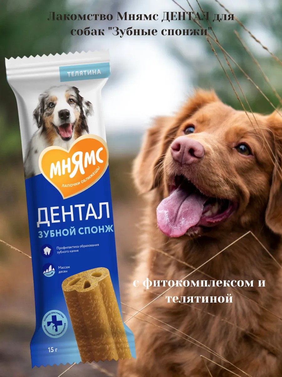 Мнямс ДЕНТАЛ "Зубные спонжи" – вкусное и полезное лакомство для взрослых собак и щенков старше 3-х месяцев. Благодаря специальной форме и структуре, спонжи позволяют эффективно и бережно очистить и отполировать зубную эмаль без применения зубной пасты, предотвращают появление зубного налета и камня, защищают от появления запаха из пасти и снижают риск развития заболеваний полости рта.