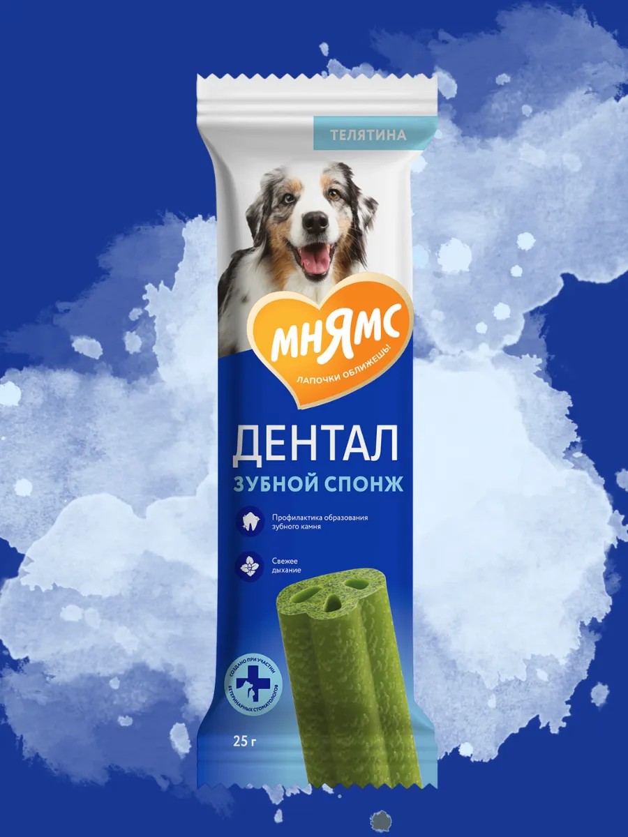 Мнямс DENTAL "Зубные спонжи" – вкусное и полезное лакомство для взрослых собак и щенков старше 3-х месяцев. Благодаря специальной форме и структуре, спонжи позволяют эффективно и бережно очистить и отполировать зубную эмаль без применения зубной пасты, предотвращают появление зубного налета и камня, защищают от появления запаха из пасти и снижают риск развития заболеваний полости рта.