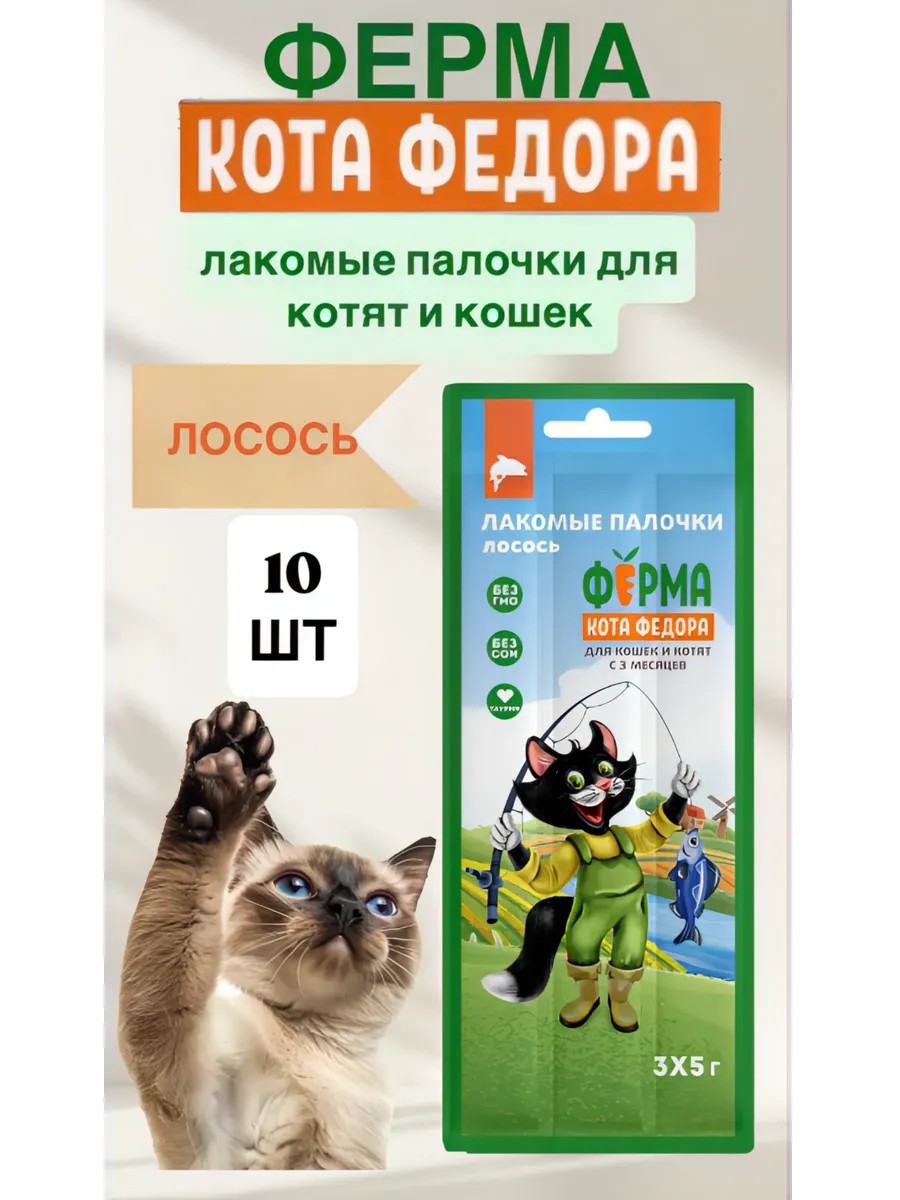 | Комплектация | Ферма кота Федора лакомство палочки со вкусом лосося 10 шт по 3 шт |