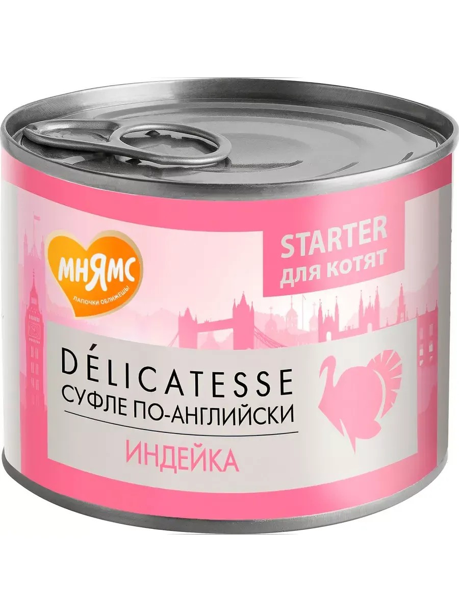 Корм Мнямс Delicatesse Starter (паштет) для котят, с индейкой, 200 г, 12 шт. Влажный корм Мнямс Паштет из индейки для котят до 4 месяцев Суфле по-английски Полнорационный суперпремиальный паштет Суфле по-английски с высоким содержанием мяса, созданный по мотивам культовых рецептов разных стран, адаптированных под потребности домашних питомцев. - подходит для котят всех пород с момента прикорма и до 4 месяцев, беременных и кормящих кошек - содержит большое количество животного белка: индейка и субпродукты не менее 63% - содержит молоко и комплекс необходимых витаминов и минеральных веществ - обладает нежной текстурой и безупречным вкусом - Без ГМО, сои, искусственных добавок и красителей. Состав Влажность - 78% Белок - 11% Жир - 6% Зола - 2%, Кальций - 0,43%, Фосфор - 0,29%. Ингредиенты индейка и субпродукты не менее 63%, молоко 4%, витамины и минеральные вещества, яичный порошок, рыбий жир, таурин.
