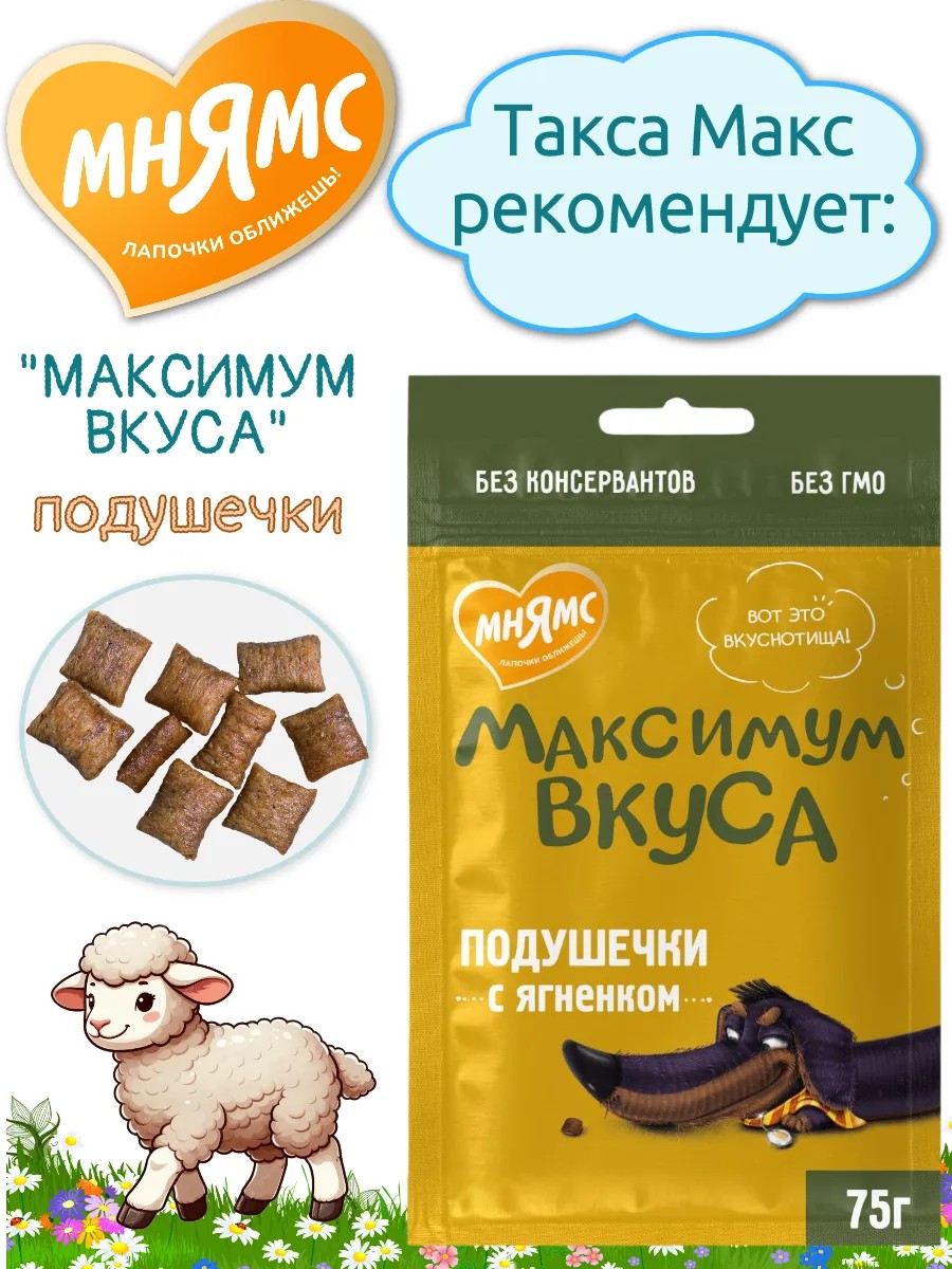 Представляем подушечки с нежным ягненком, рекомендованные нашим главным инспектором вкуса, таксой Максом! Он гарантирует: эти лакомства повышают градус счастья и заставляют хвостик вилять в 3 раза быстрее!