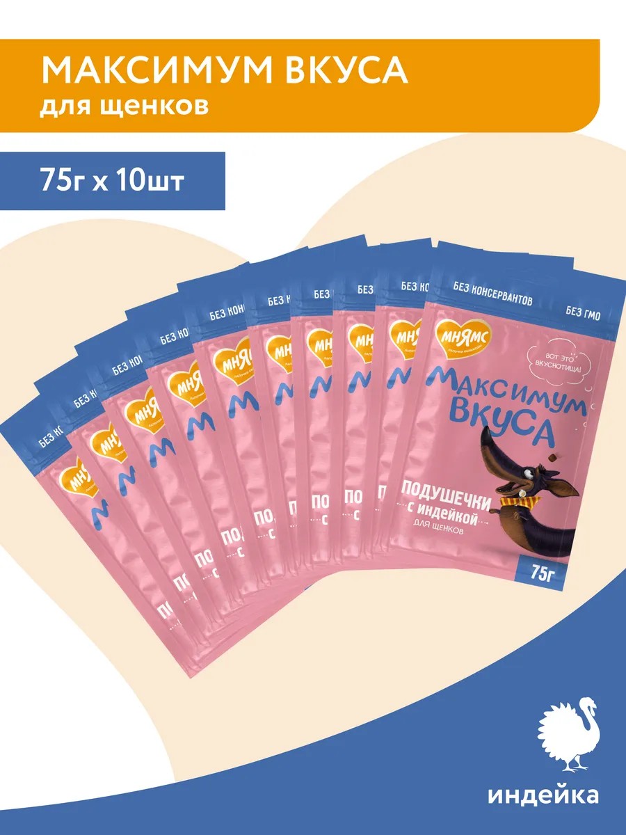 Лакомство Мнямс подушечки с индейкой для щенков «Максимум вкуса» — это идеальный выбор для вашего питомца. Продукт разработан при участии ветеринарных врачей с учетом физиологических особенностей собак. Подушечки подходят для маленьких и средних пород.