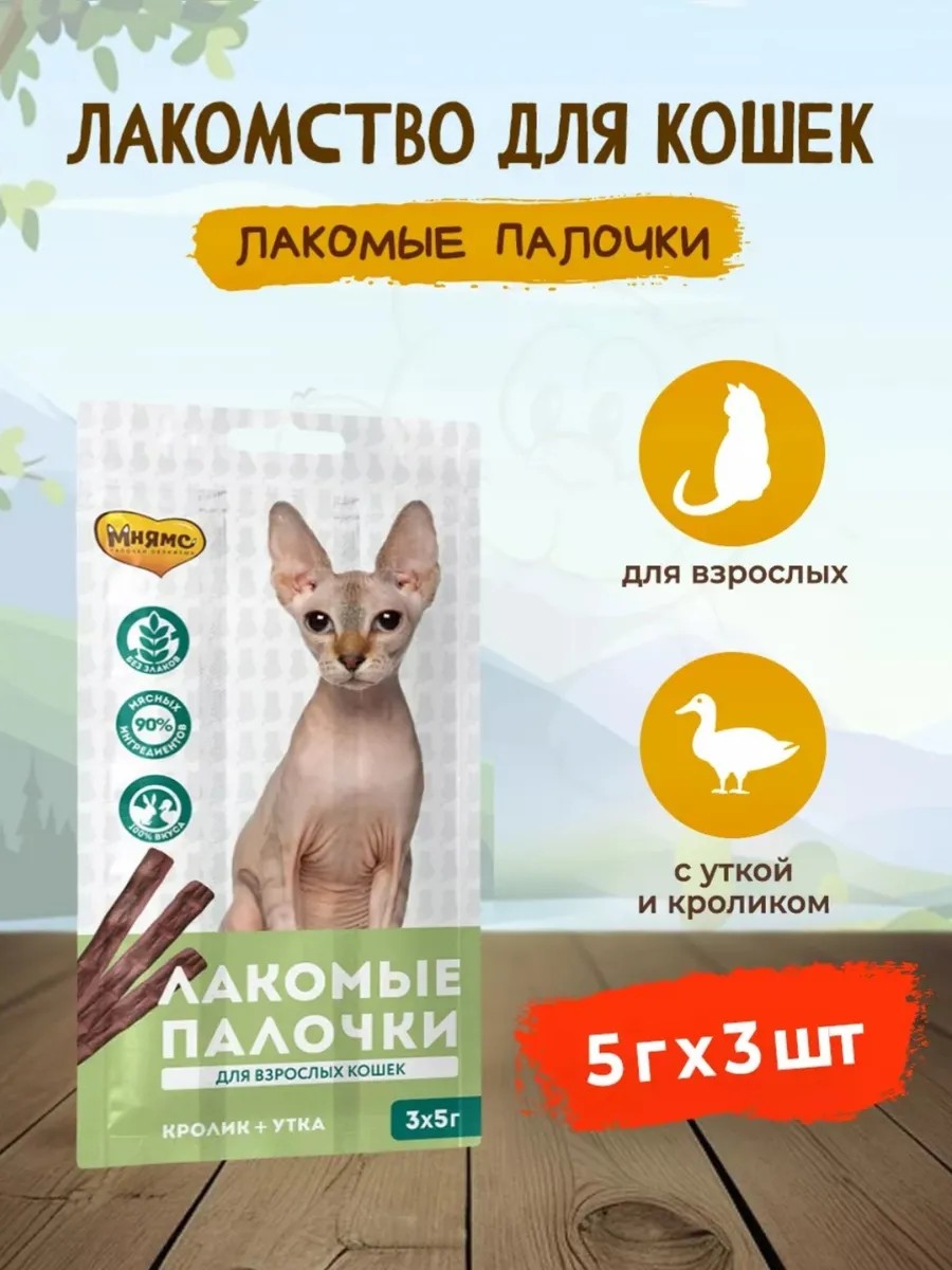 Мнямс - палочки для кошек с уткой и кроликом – придутся по вкусу даже самым привередливым кошечкам. Их состав разработан с учетом всех потребностей кошки, а также обогащен витаминами группы А, D, Е, которые принесут пользу здоровью вашего любимца. Содержит антиоксиданты.