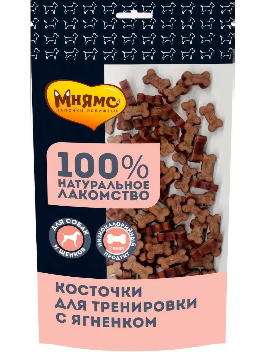 Лакомство Мнямс Тренировочные Косточки для собак, с ягненком, 90 г. Лакомство Мнямс Тренировочные Косточки для собак, с ягненком, 90 г. Мнямс тренировочные лакомства Косточки с ягненком для взрослых собак и щенков старше 3-х месяцев предназначены для поощрения питомца во время прогулки и дрессировки. Благодаря высокой вкусовой привлекательности, низкой калорийности и оптимальному размеру каждого лакомства идеальны для собак любых пород. Не пачкают руки и не крошатся, подходят для использования в интерактивных игрушках.Состав:в 100 г: белки 17 %, жиры 39 %, клетчатка 10 %, зола 1 %, влага 11 %. Энергетическая ценность на 100 г: 507 ккал. Ингредиенты:Мясо и мясные субпродукты (в том числе ягненок 26%), крахмал кукурузный, растительные масла, мальтодекстрин, клетчатка свекловичная, патока, лецитин, таурин, краситель натуральный.Суточная норма:Рекомендуемая норма потребления составляет 10% от суточного рациона животного старше 12 недель. Обеспечьте Вашему питомцу доступ к свежей питьевой воде.