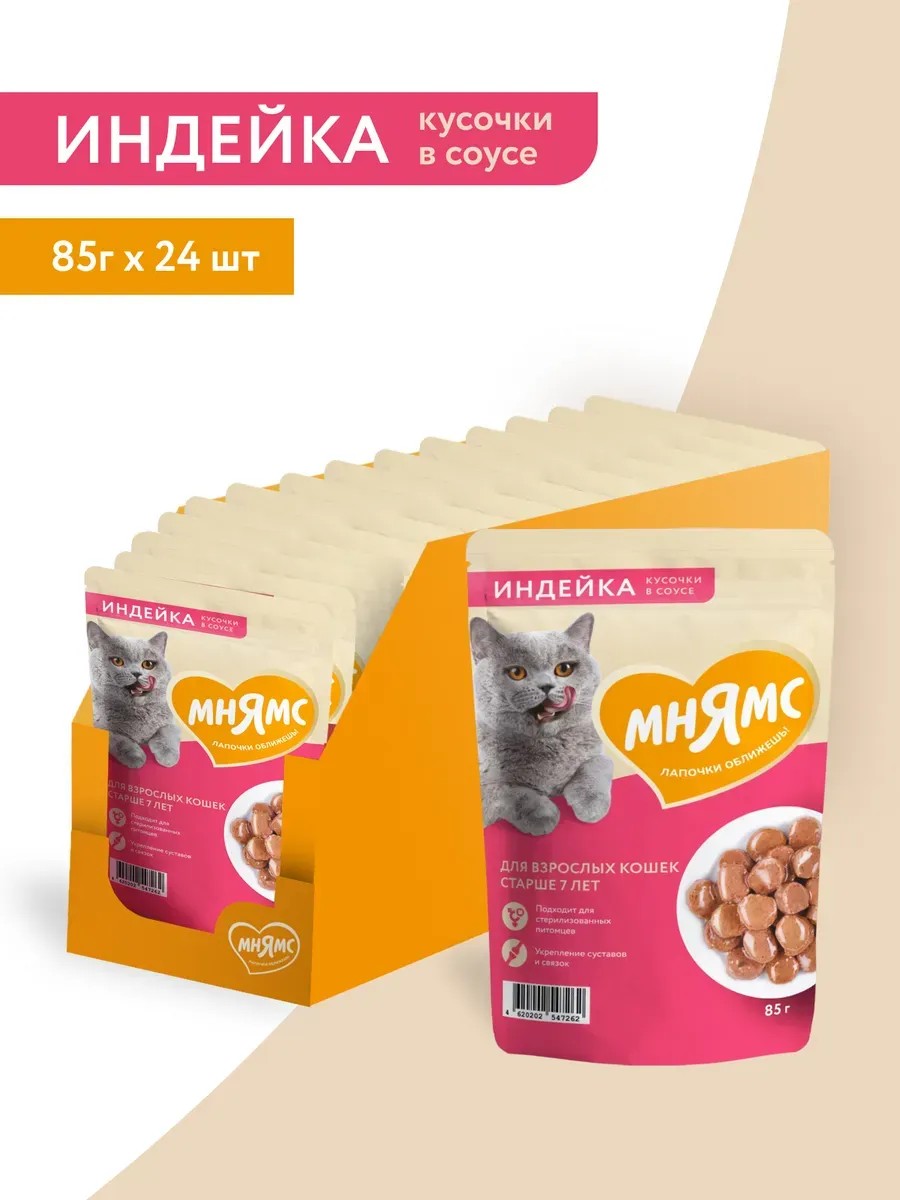 | Комплектация | Мнямс влажный корм паучи для кошек старше 7 лет 24шт х 85гр |