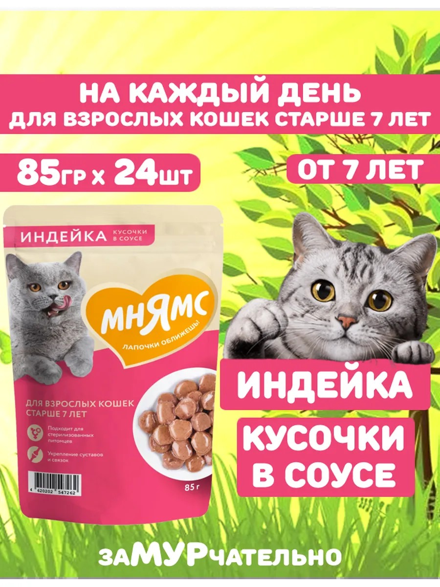 | Полное наименование товара | Влажный корм Мнямс На каждый день Кусочки в соусе с индейкой для кошек старше 7 лет 85 г |