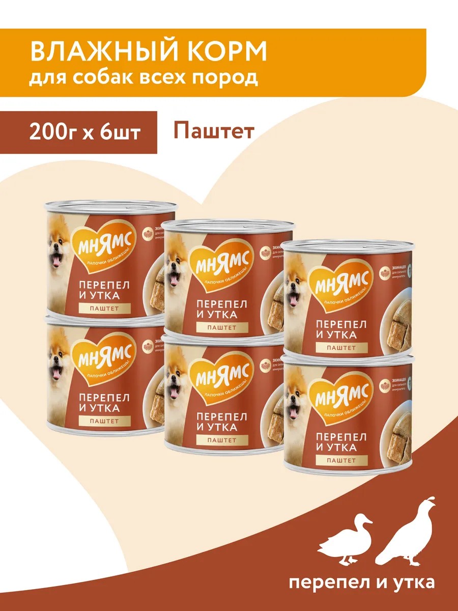 Mnyams Canned Duck and Quail Pate for Dogs of All Breeds "STRONG IMMUNITY" 200g x 6 pcs. Dogs living in big cities, just like people, are susceptible to adverse environmental influences and stress. That's why duck and quail pate is not only very filling and delicious, but also contains echinacea and brewer's yeast to boost immunity and strengthen the nervous system. Take proper care of your dog with Mnyams. No artificial colors or flavors. No soy or GMOs. Gluten-free. No preservatives. Echinacea - to boost immunity. Brewer's yeast - to strengthen the nervous system.