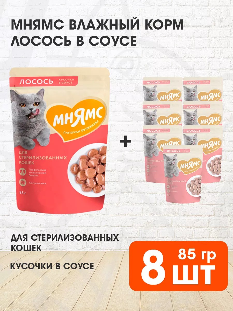 Корм Мнямс для кошек влажный - полнорационный функциональный влажный корм Мнямс для взрослых кастрированных котов и стерилизованных кошек с лососем в соусе.