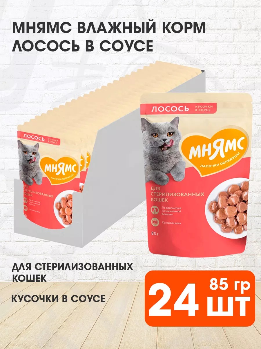 Корм Мнямс для кошек влажный - полнорационный функциональный влажный корм Мнямс для взрослых кастрированных котов и стерилизованных кошек с лососем в соусе.