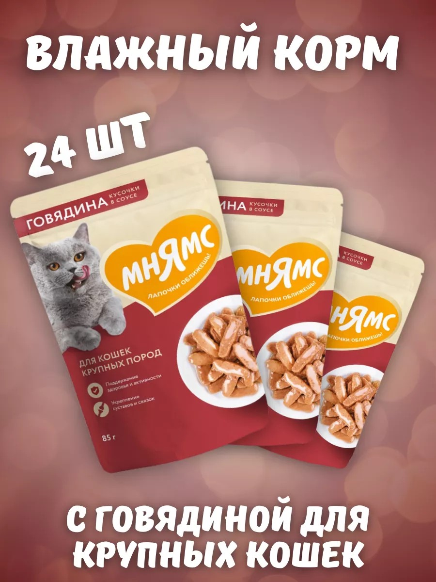 Мнямс Влажный корм Кусочки в соусе с говядиной 85г 24шт