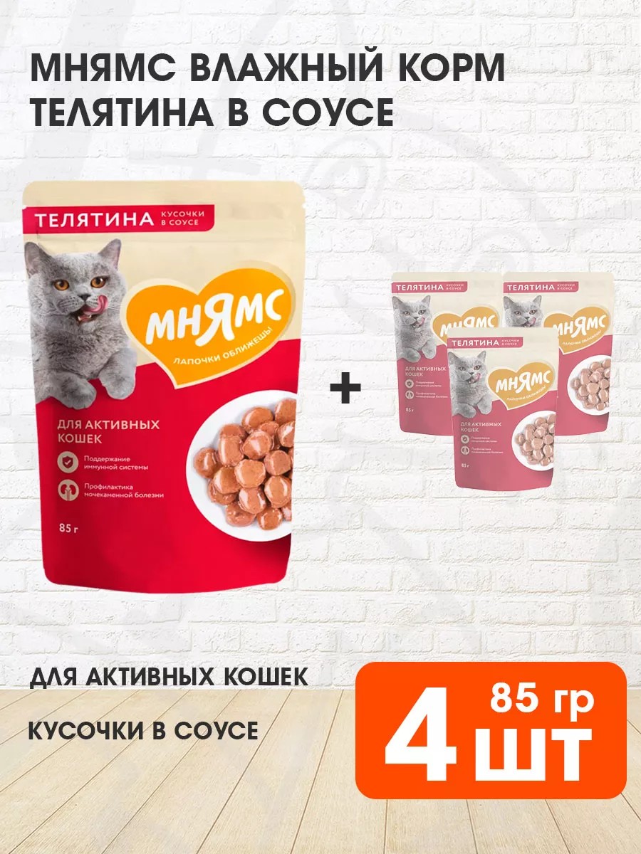 Корм Мнямс для кошек влажный - полнорационный функциональный влажный корм Мнямс для активных кошек с телятиной в соусе.