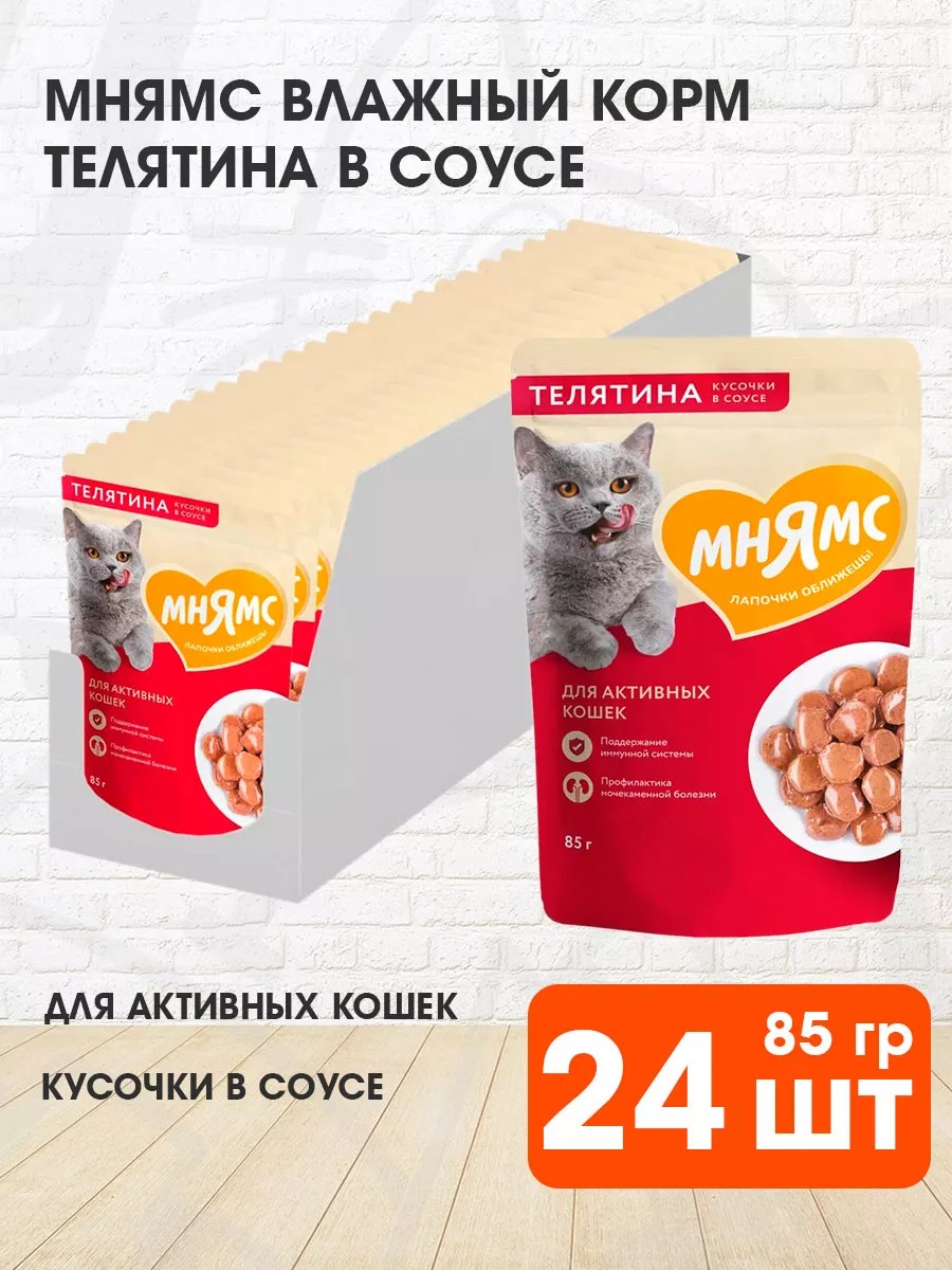 Корм Мнямс для кошек влажный - полнорационный функциональный влажный корм Мнямс для активных кошек с телятиной в соусе.