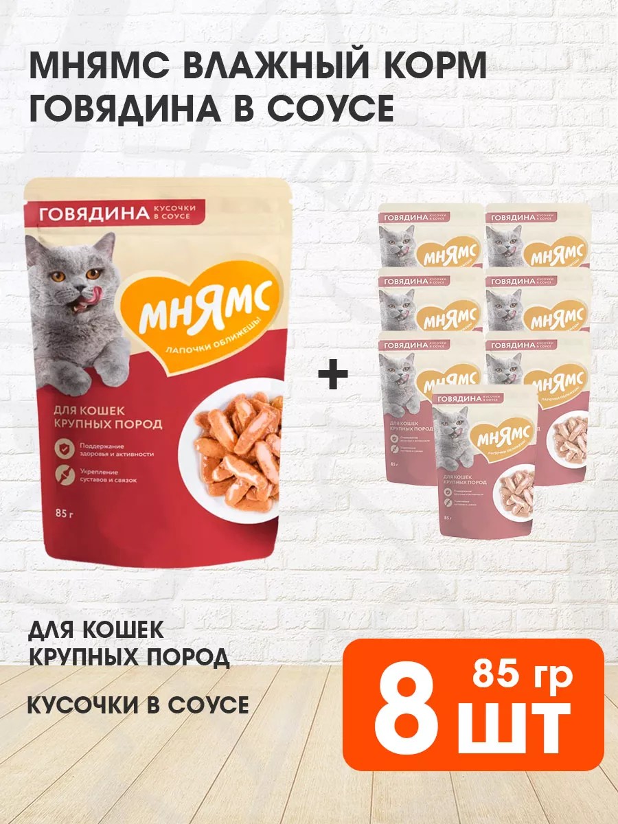 Корм Мнямс для кошек влажный - полнорационный функциональный влажный корм Мнямс для взрослых кошек крупных пород с говядиной в соусе.