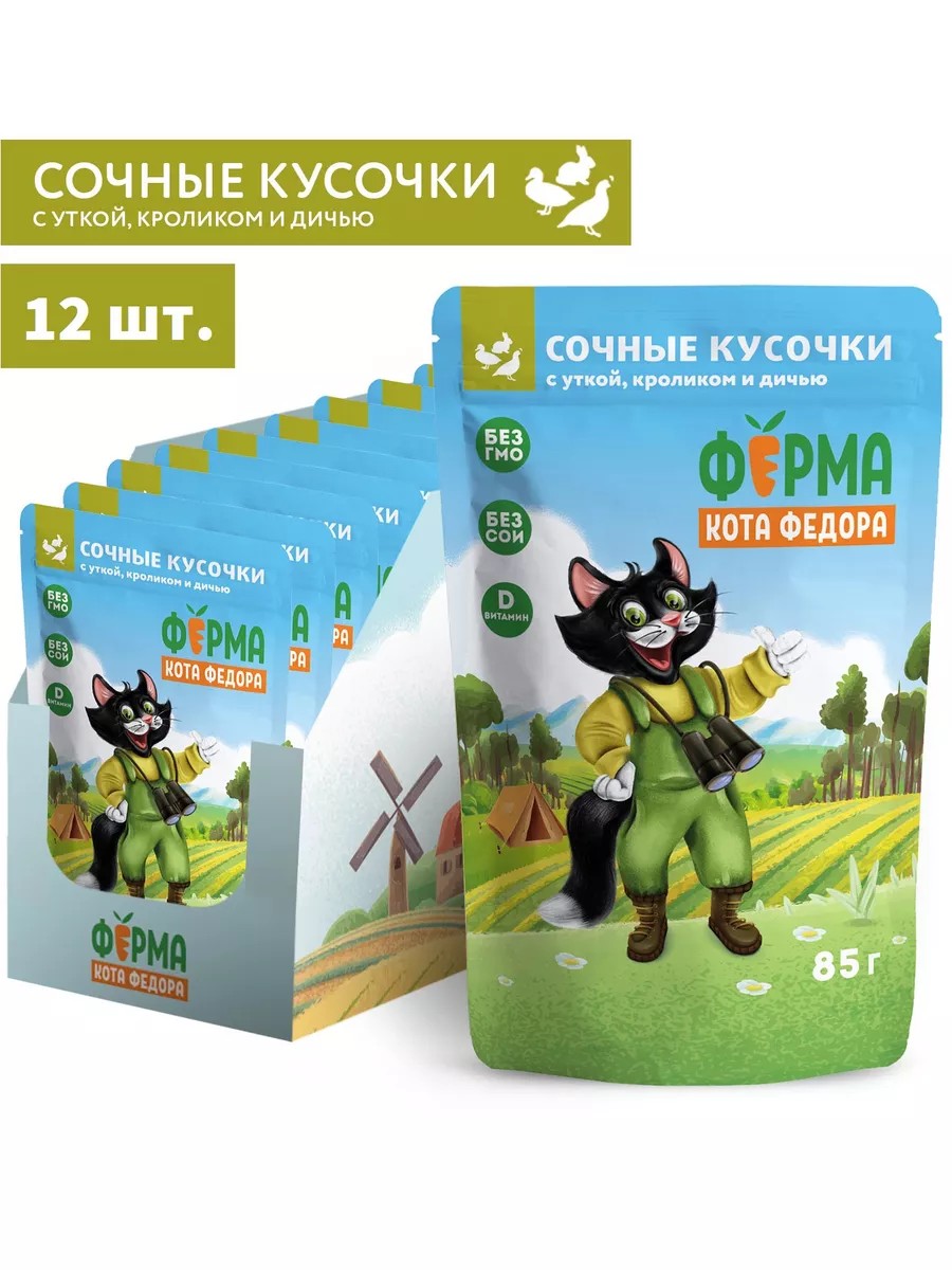 | Полное наименование товара | Влажный корм Ферма кота Фёдора мясные кусочки для кошек с уткой, кроликом и дичью 85г |