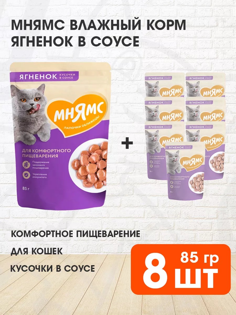 Корм Мнямс для кошек влажный - полнорационный функциональный влажный корм Мнямс для взрослых кошек для комфортного пищеварения с ягненком в соусе.