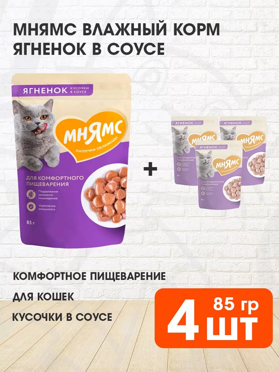 Корм Мнямс для кошек влажный - полнорационный функциональный влажный корм Мнямс для взрослых кошек для комфортного пищеварения с ягненком в соусе.
