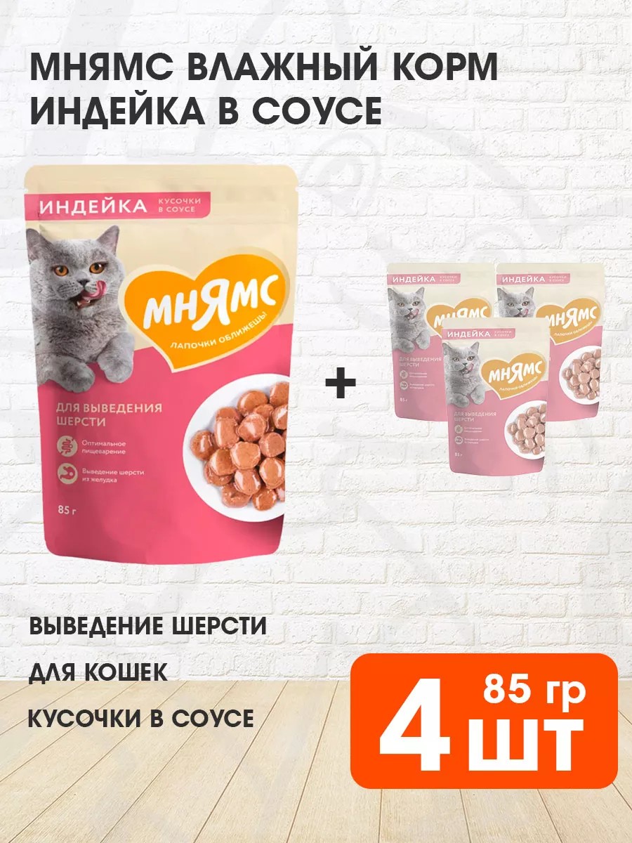 Корм Мнямс для кошек влажный - полнорационный функциональный влажный корм Мнямс для взрослых кошек для выведения шерсти с индейкой в соусе.