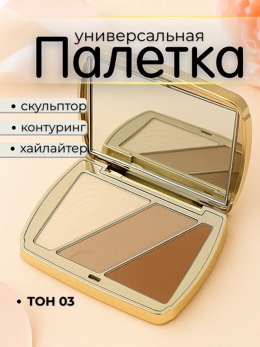 Палетка для макияжа (контуринг, бронзер, хайлайтер) — стильный и универсальный набор, который идеально подходит для создания профессионального макияжа в домашних условиях.